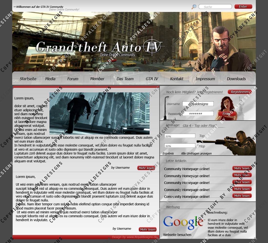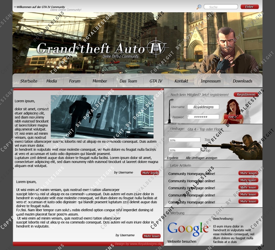 Das Design ist an eine Community angelehnt. Speziell auf eins für das berühmte Spiel des Jahres "Gta IV". Es sind einige elemente eingearbeitet worden, z.b. in dem Loginbereich und weiter runter. Die Gestaltung nimmt die Farben Rot / Weiß an und so ist es geblieben, schlicht und einfach gehalten.Im Packet wären folgende Sachen enthalten: - .psd Datei des Designs - WerbebannerHeader und weitere kleinigkeiten können kostenFREI geändert werden.