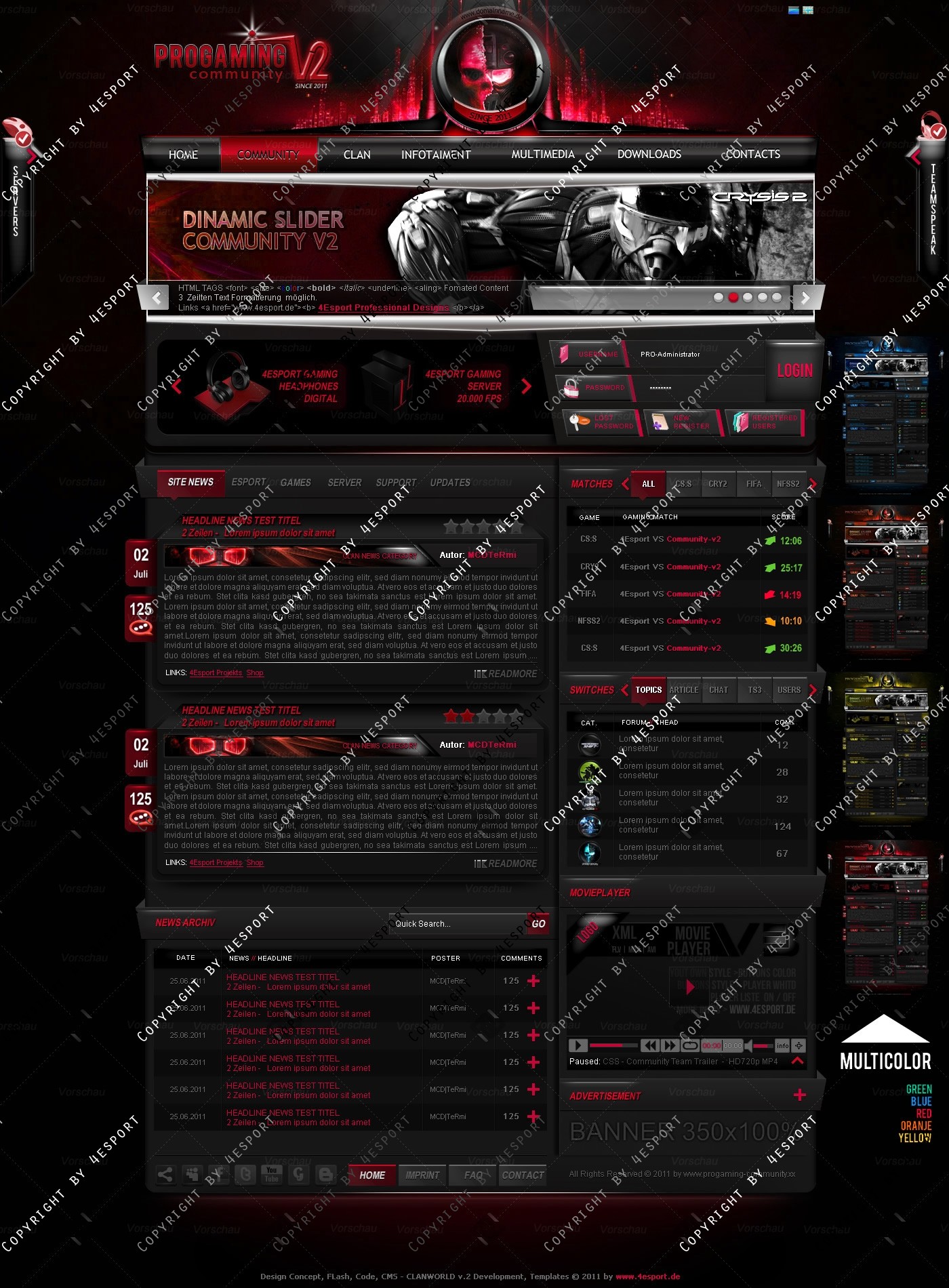 PROGaming Community V2 - Templates Premium Edition mit Flash Player 1 V3 Custom Edition und Featured System, CMS Erweiterung Webspell 4.2.2a, wird auf wünsch auf ClanWORLD v1.1 auch gecodet.